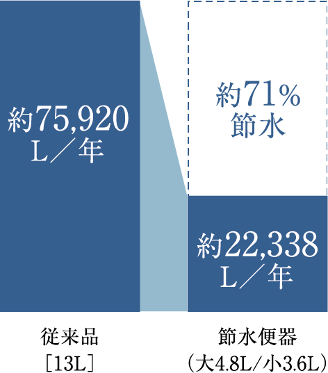 大洗浄4.8L、小洗浄3.6Lの「節水便器」。従来品(大13L)と比べ約71%の節水。水道料金がお得です。
