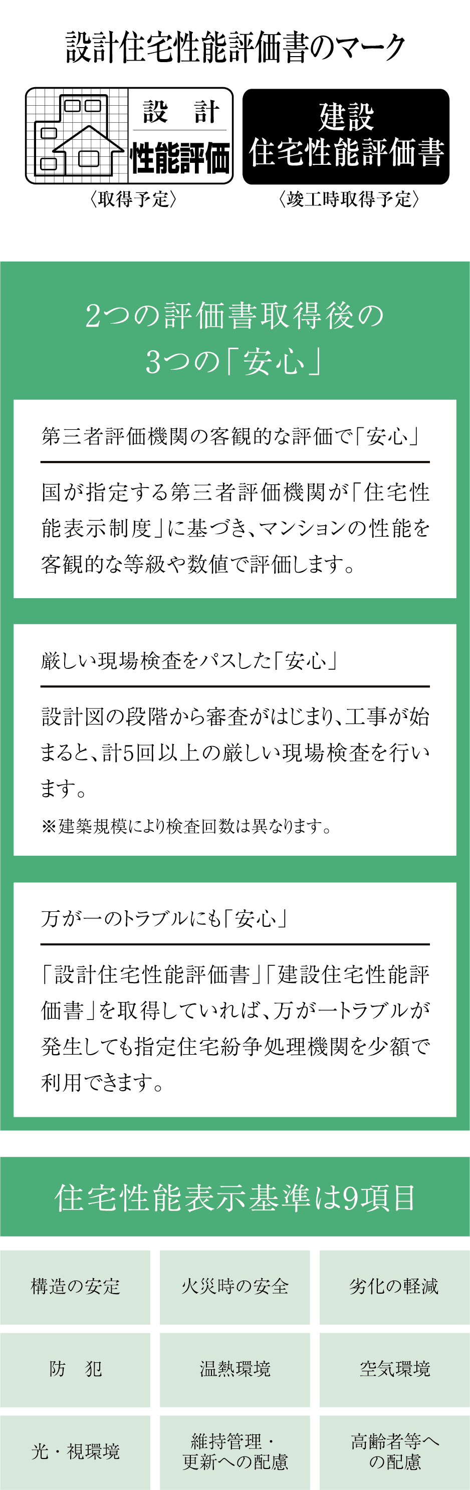 マンションは、完成した後では見えない部分の性能を確かめることはできません。そこで「住宅性能表示制度」に基づいて設計や施工、販売などに携わっていない第三者機関が客観的かつ公平にチェック。設計段階で評価を行い、交付されるのが「設計住宅性能評価書」、施工・竣工時に評価を行い、交付されるのが「建設住宅性能評価書」です。永住にふさわしい住まいづくりをめざすスマ−トマンション『シャルマンフジパーク&リンクス EST』はこの制度を積極的に導入。品質に自信があるからこそ、これらの評価書を取得しています。